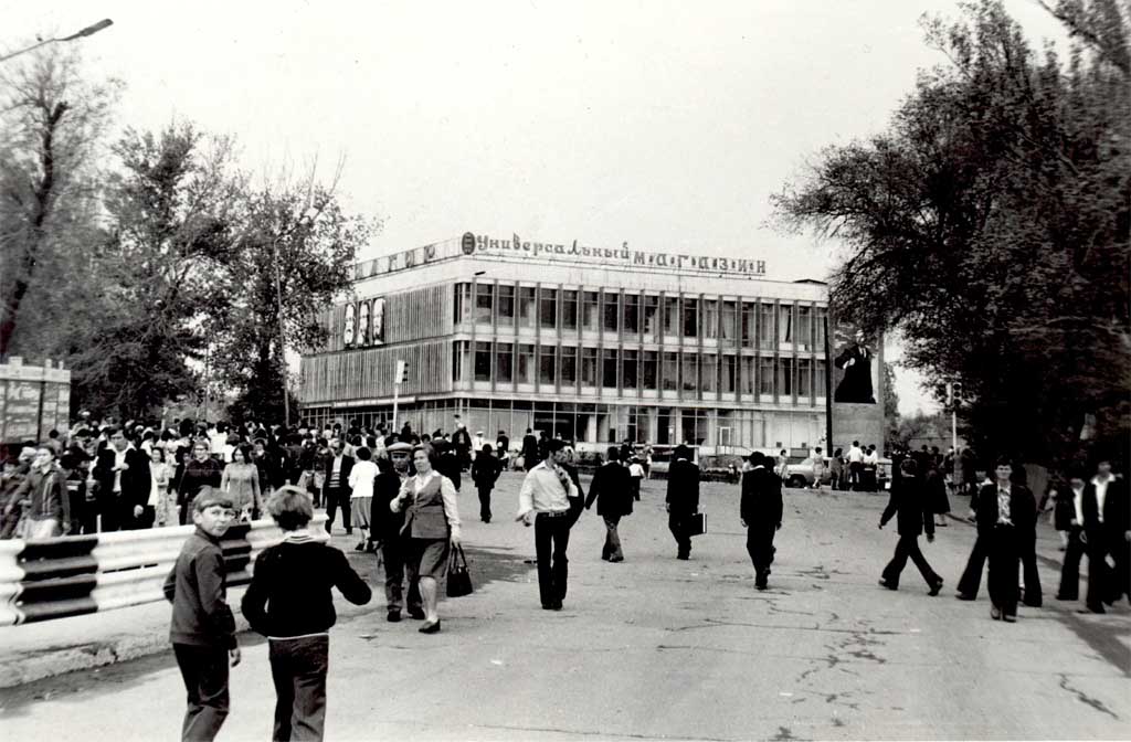 Вид на универмаг "Талгар" со стороны моста через Талгарку, 1 мая 1980 г.
